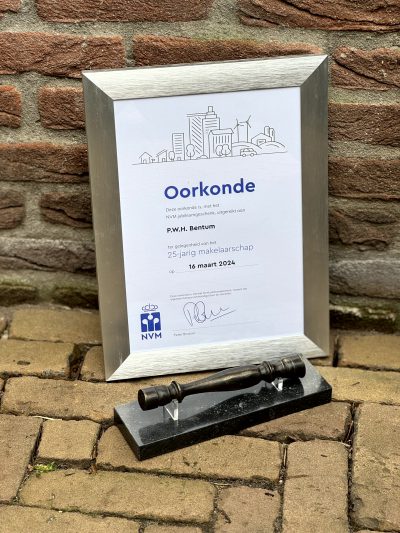 Een goed begin van de lente voor Pouwel Bentum: het bij makelaars en taxateurs welbekende makelaarsstafje en een oorkonde voor zijn zilveren jubileum. Hij is op 16 maart 2024 namelijk 25 jaar beëdigd makelaar en taxateur onroerende zaken! Reden voor een feestje dus!